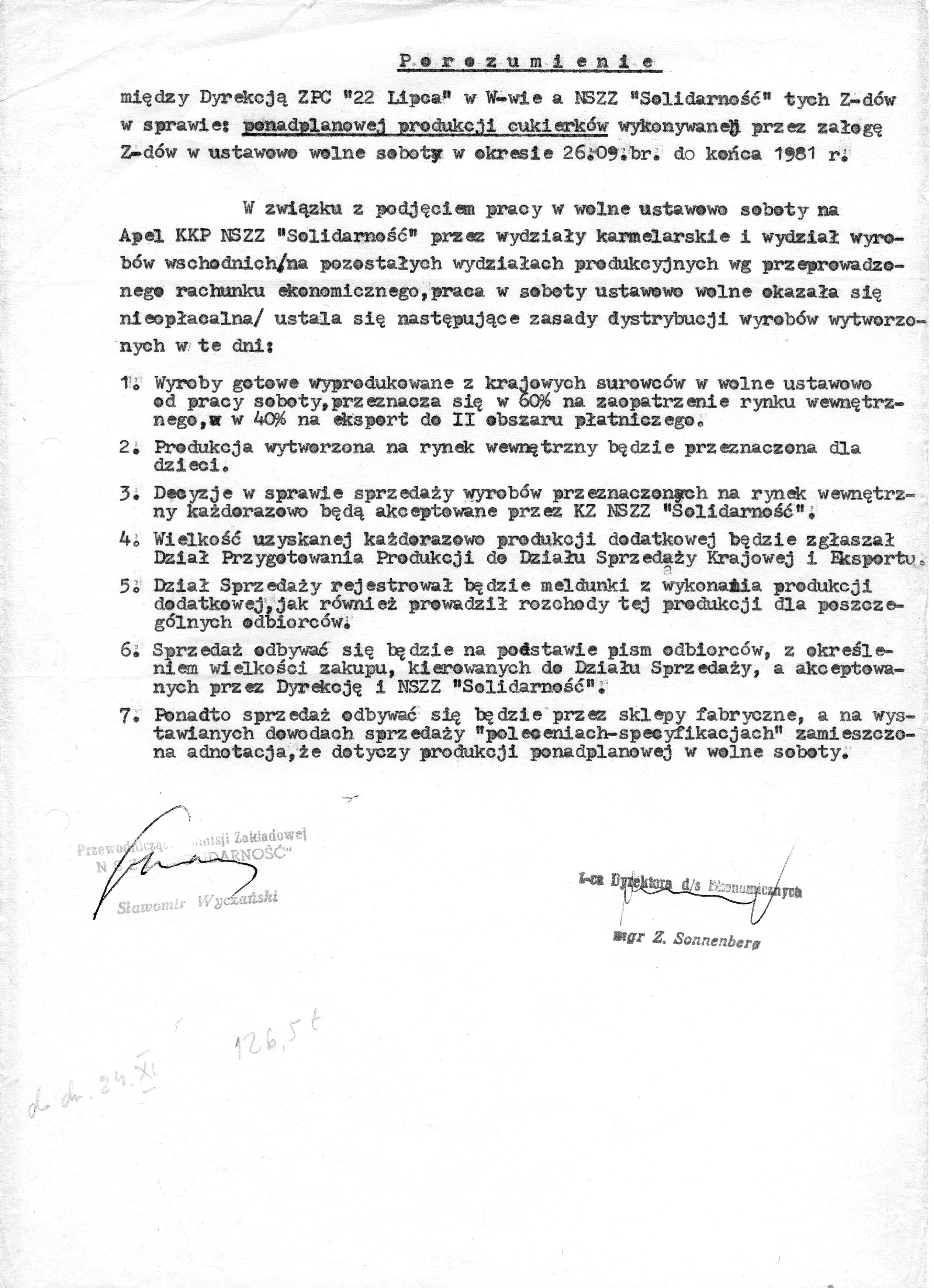 Porozumienie w sprawie wytworzonych wyrobów w wolne soboty. Podpisane przez S. Wyczańskiego - Przewodniczącego NSZZ "Solidarność, a Dyrektorem d/s Ekonomicznych Z. Sonnenbergiem
